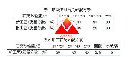 石英砂的粒度配比及搗固方法影響爐襯的使用壽命,其主要影響爐襯的耐蝕性能和抗高溫沖擊性能。經試驗,爐襯的抗侵蝕能力與其基體密度成正比,密度越大,基體組織越密,爐襯的抗侵蝕能力越強。在結合客戶實際生產的基礎上,采用表1所示的石英砂配方。爐口石英砂采用表2所示的改進配方。